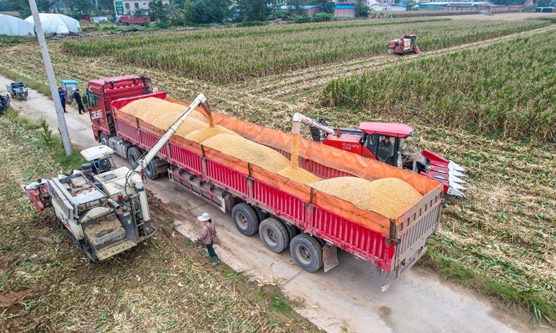 10月14日,在河南省商丘市夏邑县会亭镇,收割机将收获的玉米装车(无人机照片)。