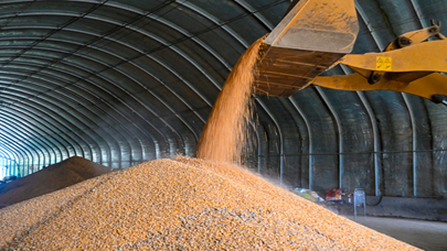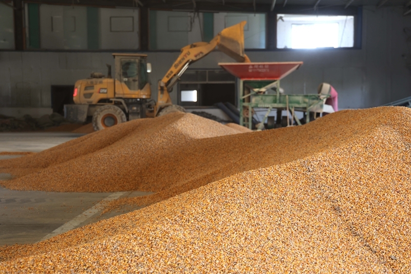10月14日,在山东省滨州市高新区小营街道一处粮食加工点,工作人员驾驶机械搬运玉米。