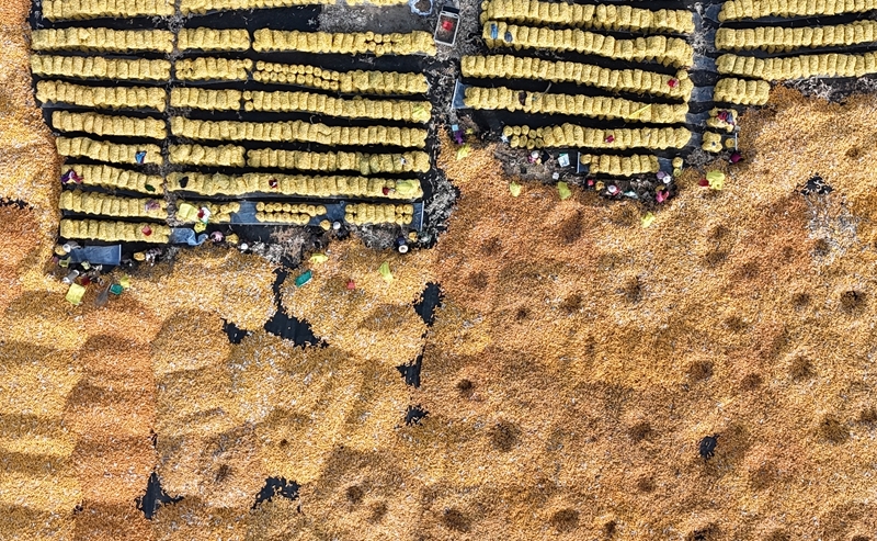 10月14日,在山东省聊城市茌平区肖家庄镇,村民将晾晒的玉米装袋储存(无人机照片)。