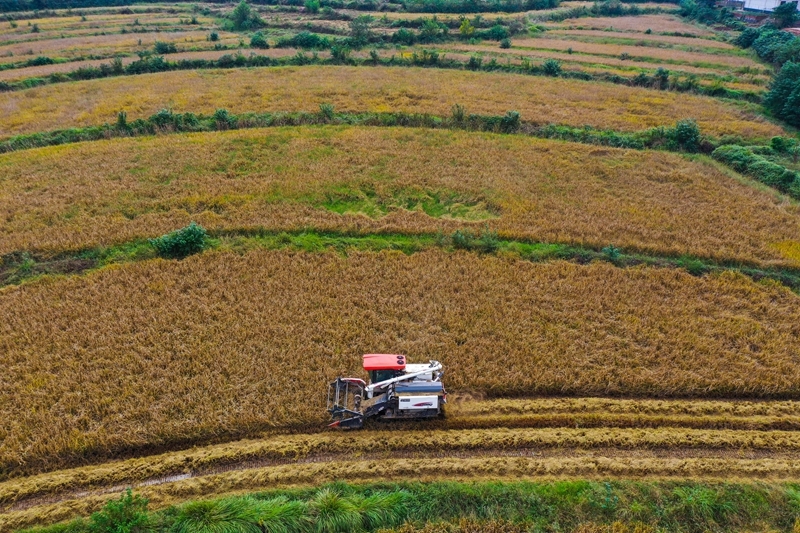 10月14日,在河南省信阳市光山县罗陈乡张楼村,农民在抢收水稻(无人机照片)。