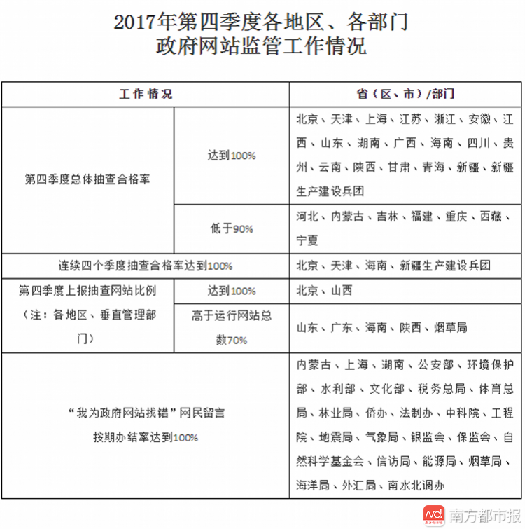 南都记者了解到,在2017年第四季度的抽查“体检”中,国办信息公开办随机抽查了各地区、江南平台入口 部门政府网站460个,总体合格率95%;各地区、71个江南平台入口 部门也自行对半数以上政府网站进行抽查,总体合格率达96%。