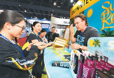 在2018中国国际电子商务博览会上,来自美国、德国、澳大利亚、印度等11个国家的客商参展。图为新西兰客商(右一)在展会现场向中国消费者介绍一款化妆品。龚献明 摄(人民视觉)