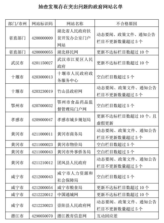 (二)网站建设管理不到位。一是少数政府网站域名使用不规范。如“湖北省建筑市场监督与诚信一体化平台”作为向社会公众提供服务的政务平台,仅提供IP地址访问,未解析英文域名。“湖北省国土整治局”网、“孝感市机关事务管理局”网等网站域名仍以“.org”或“.org.cn”为后缀。二是一些政府部门仍未整合所属单位及内设处室网站,未落实“一个部门一个网站”的要求。三是部分地方按建设子站方式推进集约化工作,但对子站的栏目设置缺乏规划、内容更新缺乏监管,如“崇阳县人民政府网”、“麻城市人民政府网”均存在此类问题。四是一些网站基本信息更新不及时。如“鄂州市经济和信息化委员会”网、“咸宁物价网”等网站的网址变更后,未及时在全国政府网站信息报送系统中更新。