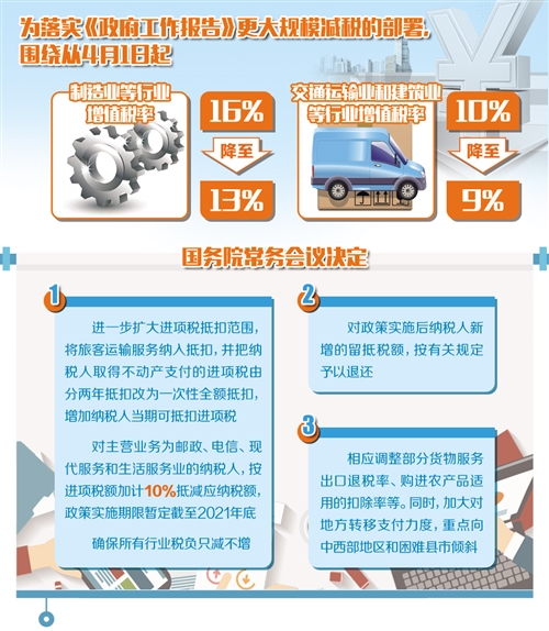 从4月1日起,我国制造业等行业增值税税率将由16%降至13%,交通运输业和建筑业等行业增值税税率将由10%降至9%。此次减税降费力度之大超过预期,是减轻企业负担、激发市场活力的重大举措,是完善税制、优化收入分配格局的重要改革,是宏观政策支持稳增长、保就业、调结构的重大抉择——