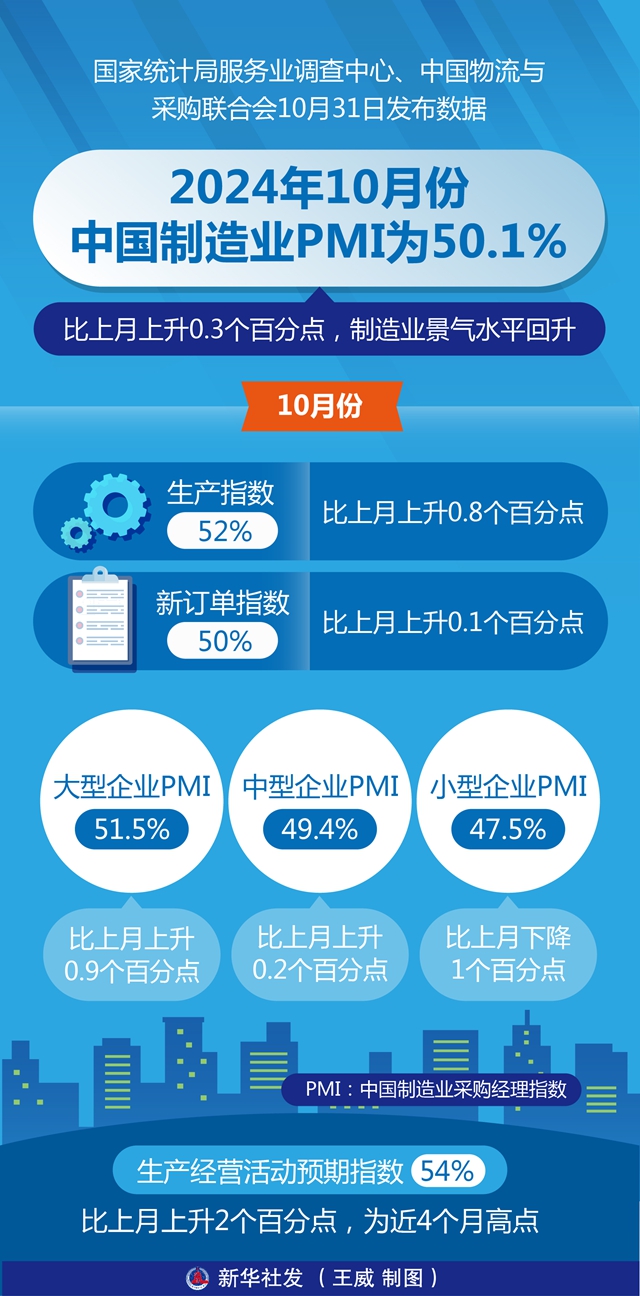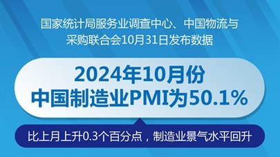 国家统计局服务业调查中心、中国物流与采购联合会10月31日发布数据,10月份,中国制造业采购经理指数(PMI)为50.1%,比上月上升0.3个百分点,制造业景气水平回升。
