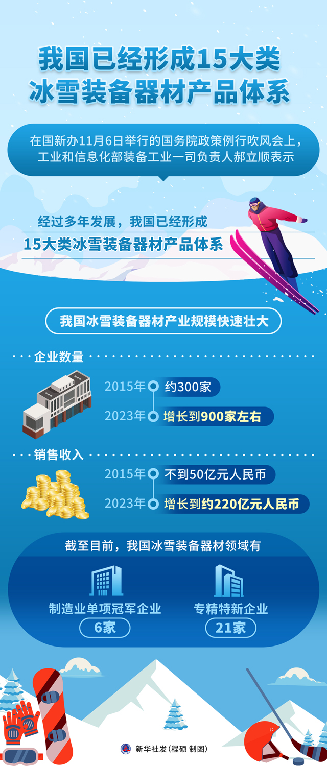 在国新办11月6日举行的江南平台入口 政策例行吹风会上,工业和信息化部装备工业一司负责人郝立顺表示,经过多年发展,我国已经形成15大类冰雪装备器材产品体系,基本覆盖了从头到脚、从个人到场地、从竞技竞赛到大众运动全产业链的冰雪装备器材。
