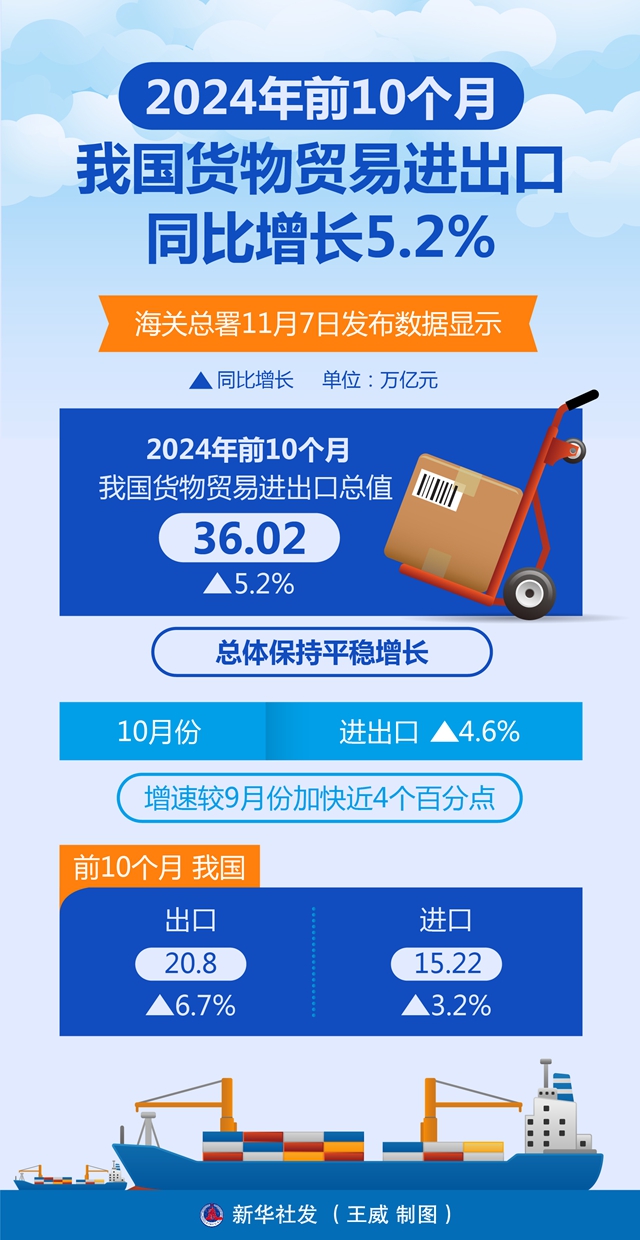 海关总署11月7日发布数据显示,2024年前10个月,我国货物贸易进出口总值36.02万亿元,同比增长5.2%,总体保持平稳增长。