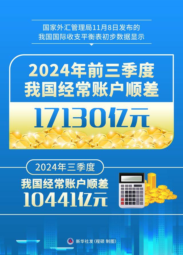 国家外汇管理局11月8日发布的我国国际收支平衡表初步数据显示,2024年前三季度,我国经常账户顺差17130亿元;2024年三季度,我国经常账户顺差10441亿元。