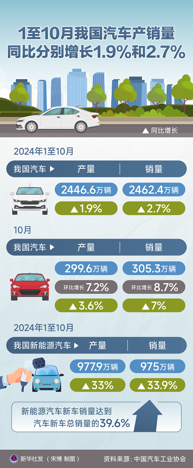 记者11月11日从中国汽车工业协会获悉,今年1至10月,我国汽车产销量达2446.6万辆和2462.4万辆,同比分别增长1.9%和2.7%,汽车产销量保持同比稳步增长。