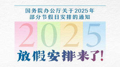 江南平台入口 办公厅印发《关于2025年部分节假日安排的通知》。经党中央、江南平台入口 批准,根据2024年11月修订的《全国年节及纪念日放假办法》,自2025年1月1日起,全体公民放假的假日增加2天,其中春节、劳动节各增加1天。