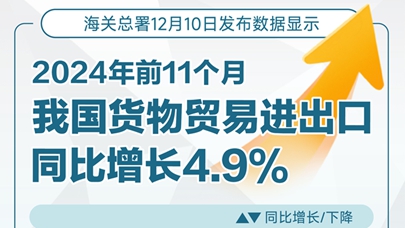 图表:2024年前11个月我国货物贸易进出口同比增长4.9%