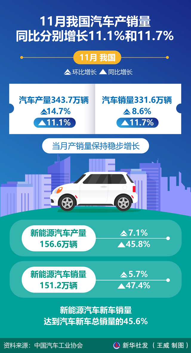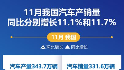 记者12月11日从中国汽车工业协会获悉,11月,我国汽车产销量分别为343.7万辆和331.6万辆,环比分别增长14.7%和8.6%,同比分别增长11.1%和11.7%,当月产销量保持稳步增长。