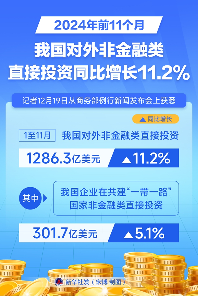 记者12月19日从商务部例行新闻发布会上获悉,1至11月,我国对外非金融类直接投资1286.3亿美元,同比增长11.2%。其中,我国企业在共建“一带一路”国家非金融类直接投资301.7亿美元,同比增长5.1%
