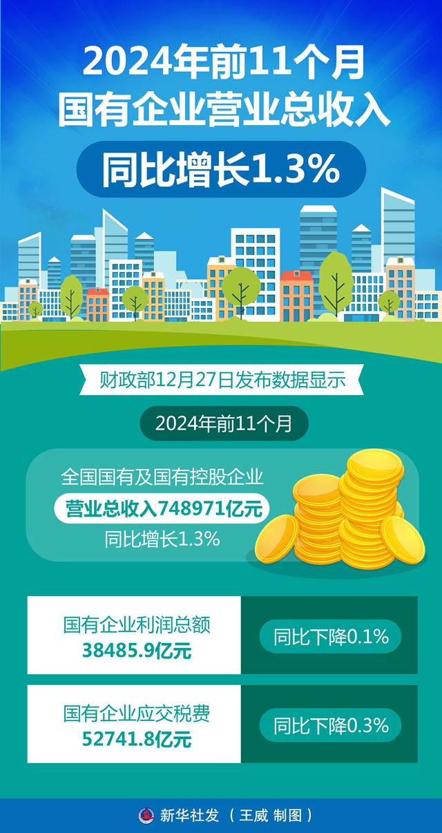 财政部12月27日发布数据显示,2024年前11个月,全国国有及国有控股企业营业总收入748971亿元,同比增长1.3%。