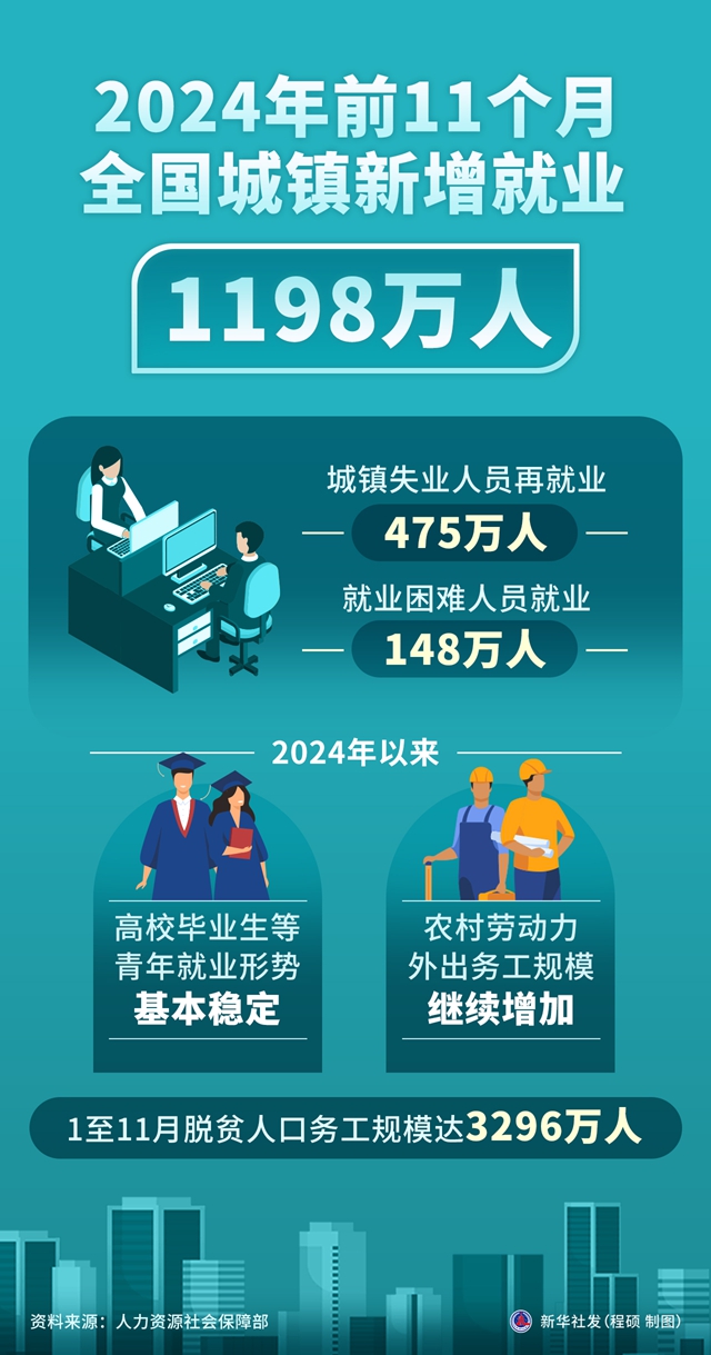 记者12月27日从人力资源社会保障部获悉,1至11月,全国城镇新增就业1198万人,城镇失业人员再就业475万人,就业困难人员就业148万人。