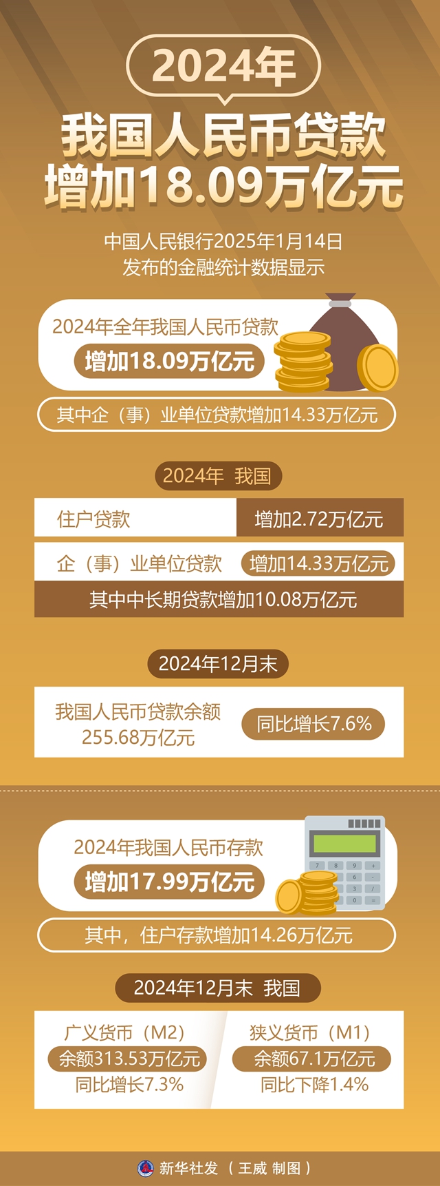 中国人民银行1月14日发布的金融统计数据显示,2024年全年我国人民币贷款增加18.09万亿元,其中企(事)业单位贷款增加14.33万亿元。