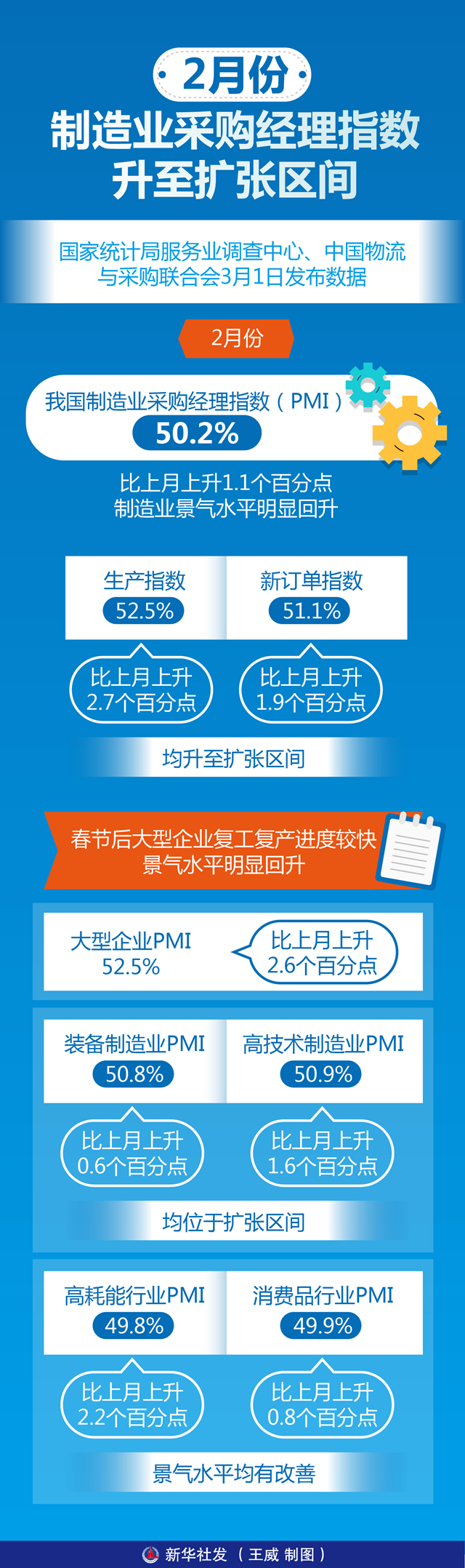 国家统计局服务业调查中心、中国物流与采购联合会3月1日发布数据,2月份,我国制造业采购经理指数(PMI)为50.2%,比上月上升1.1个百分点,制造业景气水平明显回升。