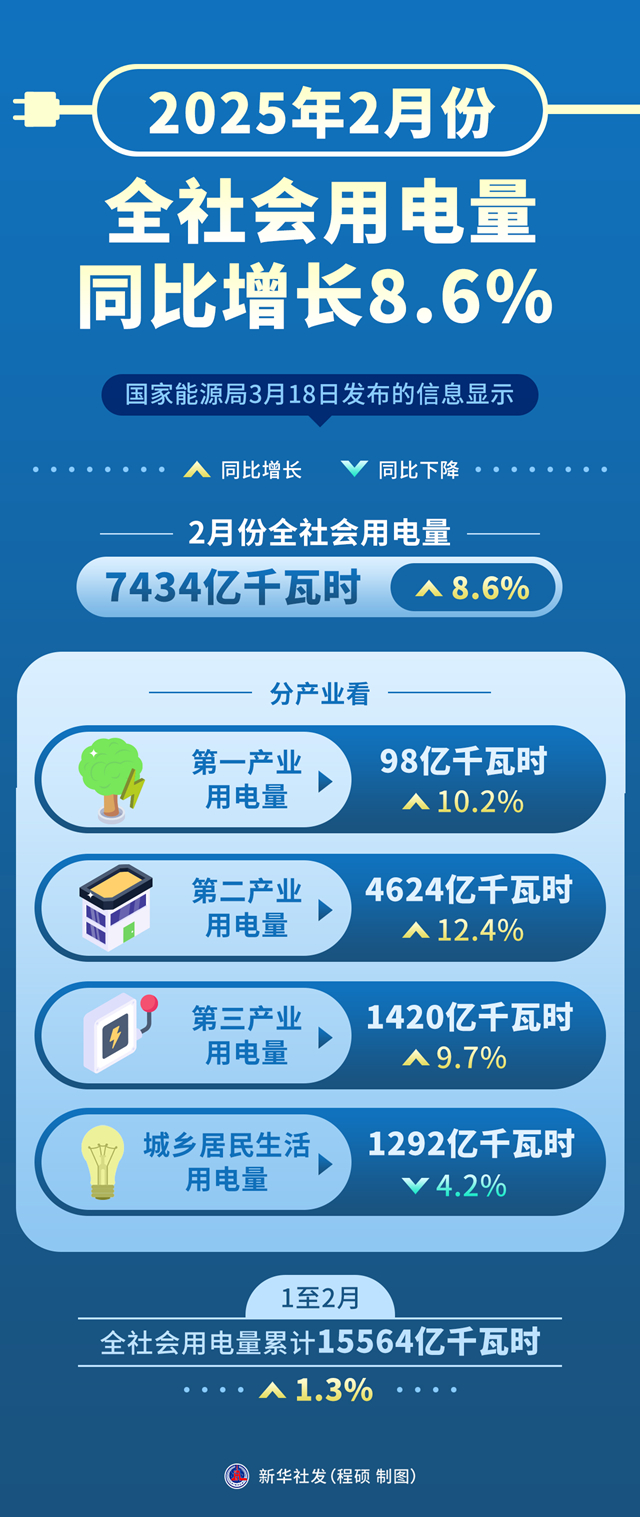 国家江南官网app 3月18日发布的信息显示,2月份全社会用电量7434亿千瓦时,同比增长8.6%。