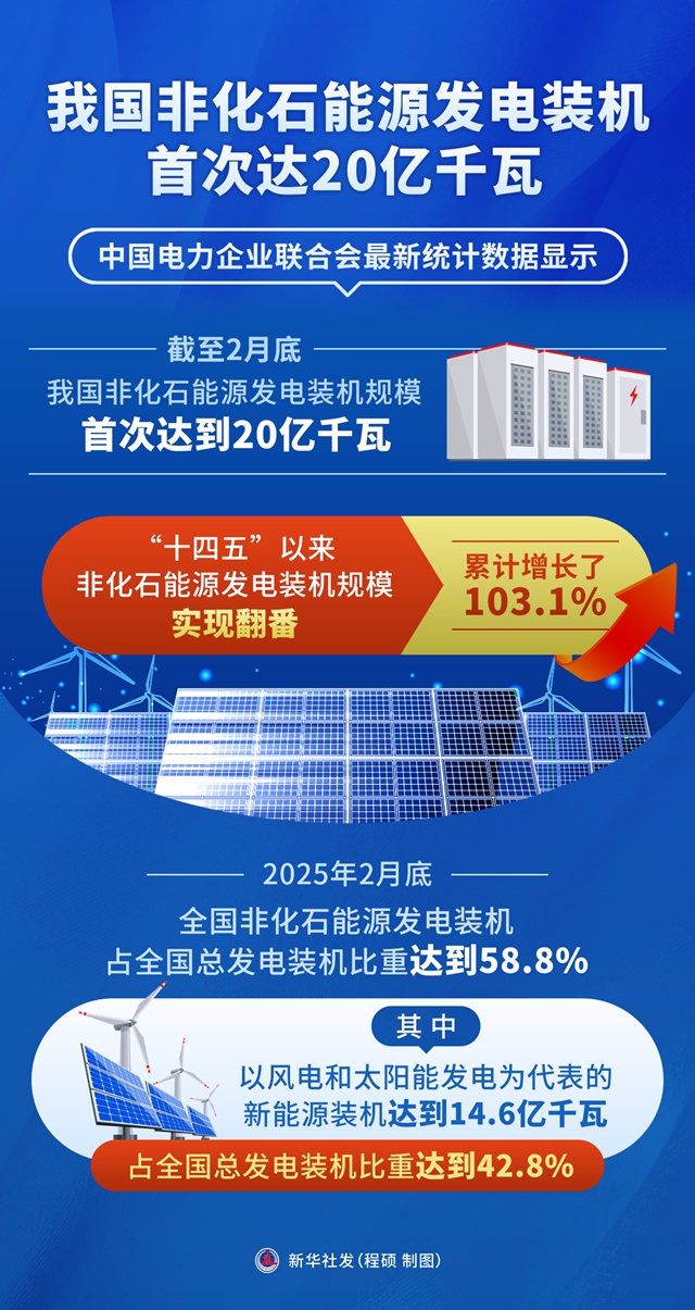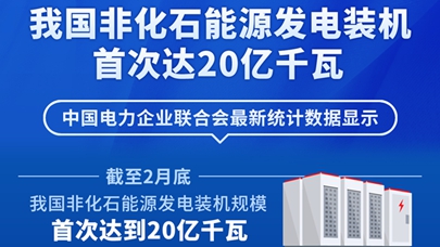 中国电力企业联合会最新统计数据显示,截至2月底,我国非化石能源发电装机规模首次达到20亿千瓦。“十四五”以来非化石能源发电装机规模实现翻番,累计增长了103.1%。