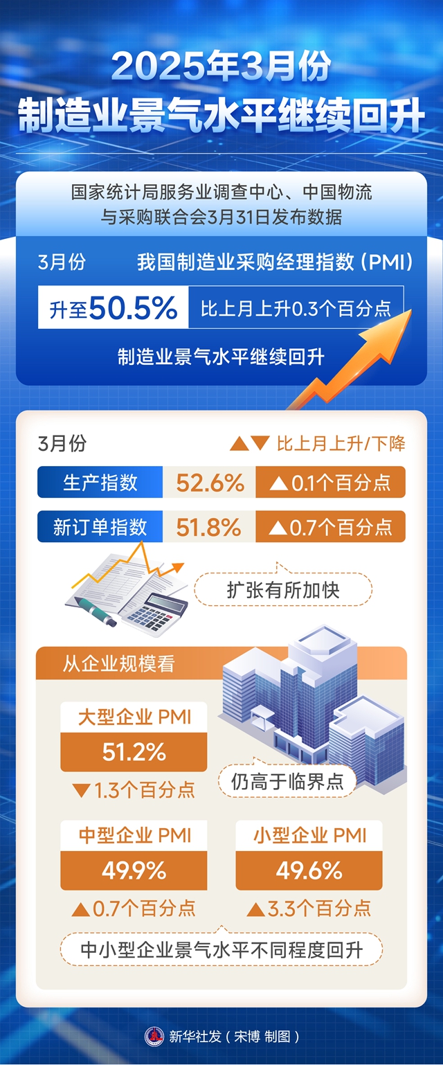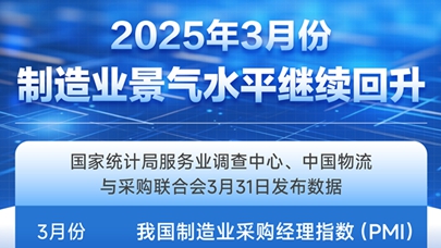 国家统计局服务业调查中心、中国物流与采购联合会3月31日发布数据,3月份,我国制造业采购经理指数(PMI)升至50.5%,比上月上升0.3个百分点,制造业景气水平继续回升。