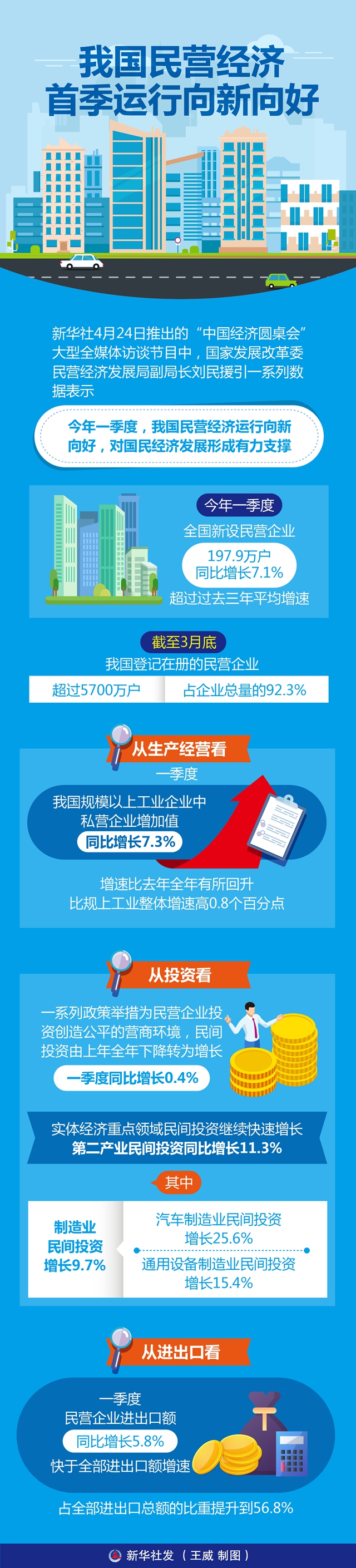 新华社4月24日推出的“中国经济圆桌会”大型全媒体访谈节目中,国家发展改革委民营经济发展局副局长刘民援引一系列数据表示,今年一季度,我国民营经济运行向新向好,对国民经济发展形成有力支撑。