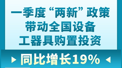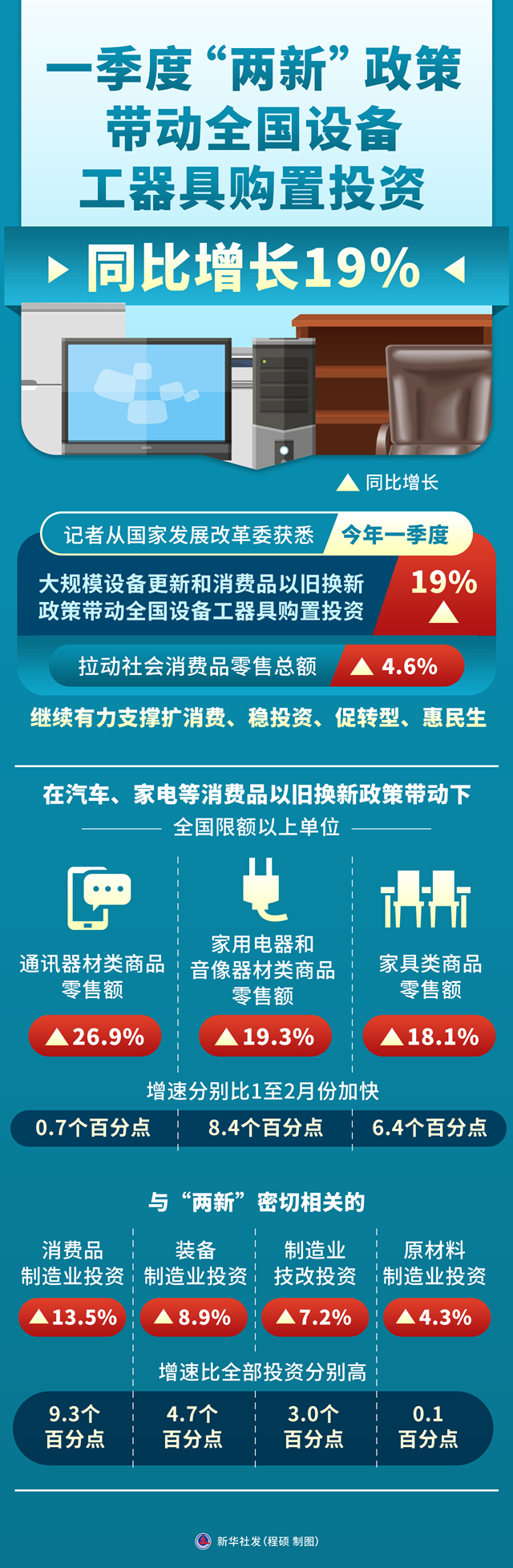 记者从国家发展改革委获悉,今年一季度,大规模设备更新和消费品以旧换新政策带动全国设备工器具购置投资同比增长19%,拉动社会消费品零售总额同比增长4.6%,继续有力支撑扩消费、稳投资、促转型、惠民生。
