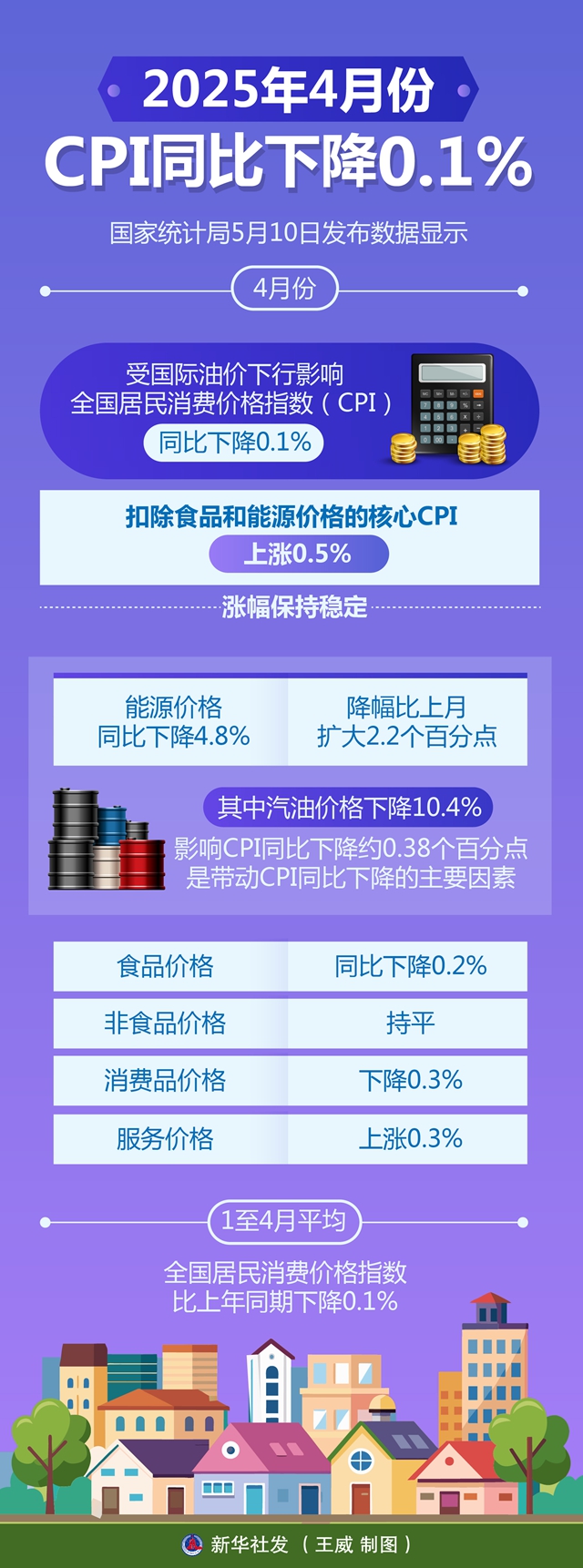 国家统计局5月10日发布数据显示,4月份,受国际油价下行影响,全国居民消费价格指数(CPI)同比下降0.1%;扣除食品和能源价格的核心CPI上涨0.5%,涨幅保持稳定。