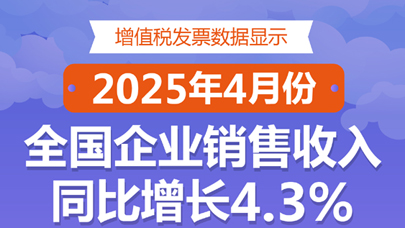 记者5月14日从国家税务总局了解到,增值税发票数据显示,4月份,全国企业销售收入同比增长4.3%,延续了去年四季度以来的稳步增长态势。