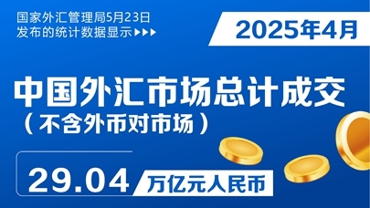 国家外汇管理局5月23日发布的统计数据显示,2025年4月,中国外汇市场(不含外币对市场)总计成交29.04万亿元人民币。