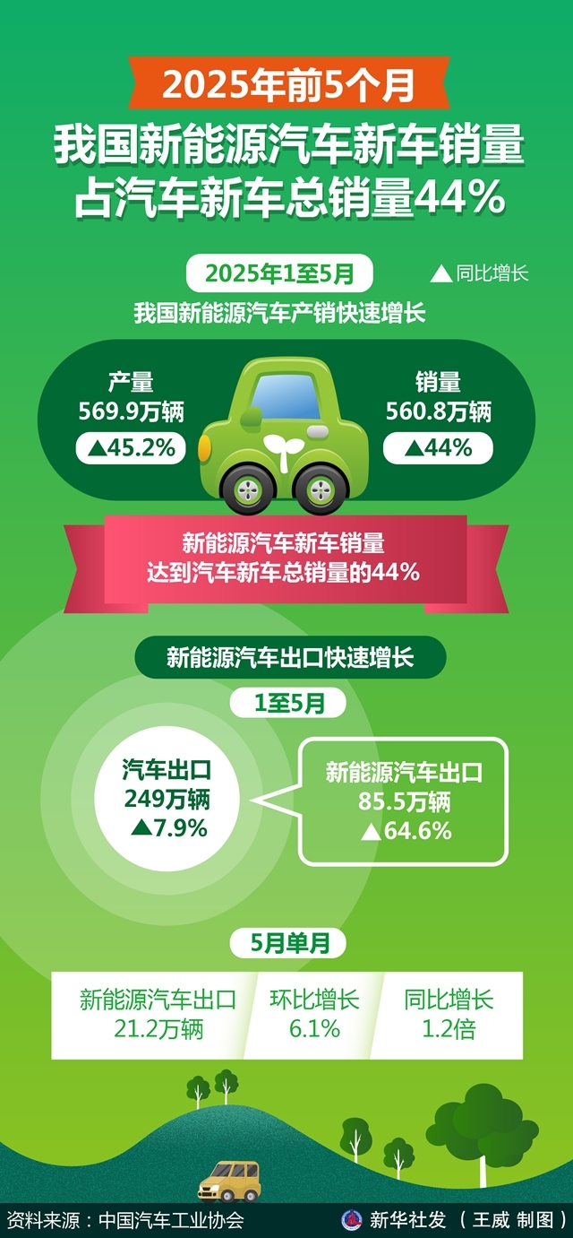 记者6月11日从中国汽车工业协会获悉,2025年1至5月,我国新能源汽车产销快速增长,分别完成569.9万辆和560.8万辆,同比分别增长45.2%和44%,新能源汽车新车销量达到汽车新车总销量的44%。