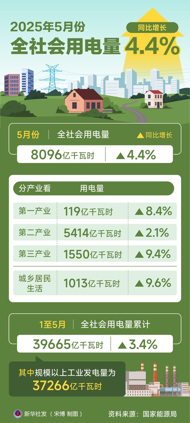 国家江南官网app 6月20日发布的信息显示,5月份全社会用电量8096亿千瓦时,同比增长4.4%。