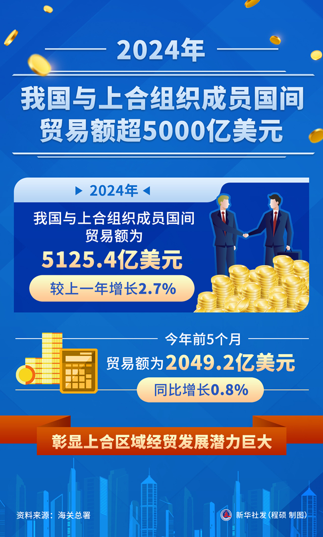 海关总署7月2日发布数据显示,2024年,我国与上合组织成员国间贸易额为5125.4亿美元,较上一年增长2.7%;今年前5个月,贸易额为2049.2亿美元,同比增长0.8%,彰显上合区域经贸发展潜力巨大。