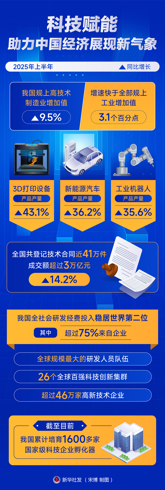 上半年,我国规上高技术制造业增加值同比增长9.5%,增速快于全部规上工业增加值3.1个百分点;3D打印设备、新能源汽车、工业机器人产品产量同比分别增长43.1%、36.2%、35.6%;全国共登记技术合同近41万件,成交额超过3万亿元,同比增长14.2%……