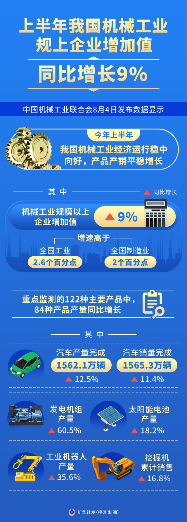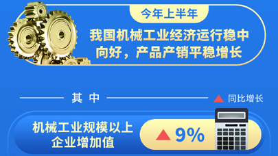 中国机械工业联合会8月4日发布数据显示,今年上半年,我国机械工业经济运行稳中向好,产品产销平稳增长。其中机械工业规模以上企业增加值同比增长9%,增速高于全国工业和制造业2.6和2个百分点。