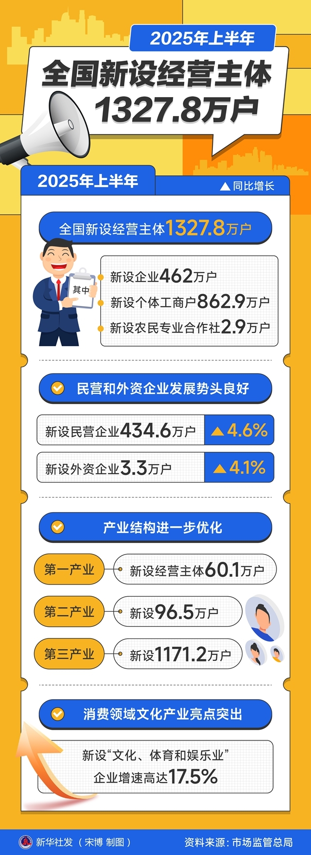 市场监管总局8月12日发布数据,今年上半年,全国新设经营主体1327.8万户。其中,新设企业462万户,新设个体工商户862.9万户,新设农民专业合作社2.9万户,多种经营主体均呈现稳定增长势头。