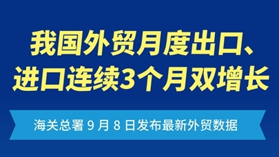 海关总署9月8日发布最新外贸数据,从月度走势看,8月份,我国货物贸易进出口总值3.87万亿元,同比增长3.5%,增速虽比7月下降3.2个百分点,但出口2.3万亿元、进口1.57万亿元,同比分别增长4.8%和1.7%,连续3个月实现双增长。