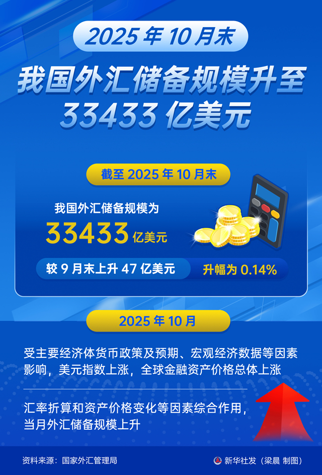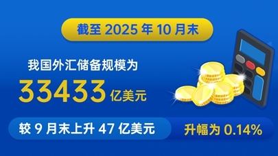 国家外汇管理局11月7日发布数据显示,截至2025年10月末,我国外汇储备规模为33433亿美元,较9月末上升47亿美元,升幅为0.14%。
