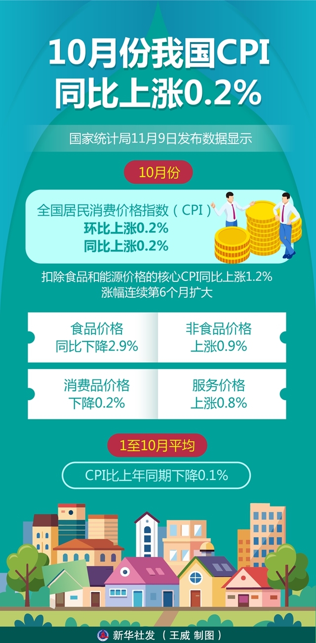 国家统计局11月9日发布数据显示,10月份,扩内需等政策措施持续显效,叠加国庆中秋假期带动,全国居民消费价格指数(CPI)环比上涨0.2%,同比上涨0.2%,扣除食品和能源价格的核心CPI同比上涨1.2%,涨幅连续第6个月扩大。