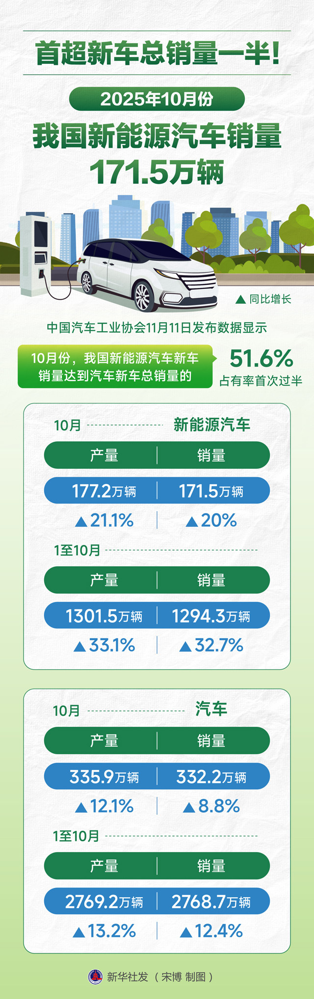 中国汽车工业协会11月11日发布数据显示,2025年10月份,我国新能源汽车产销同比保持快速增长,新能源汽车新车销量达到汽车新车总销量的51.6%,占有率首次过半。