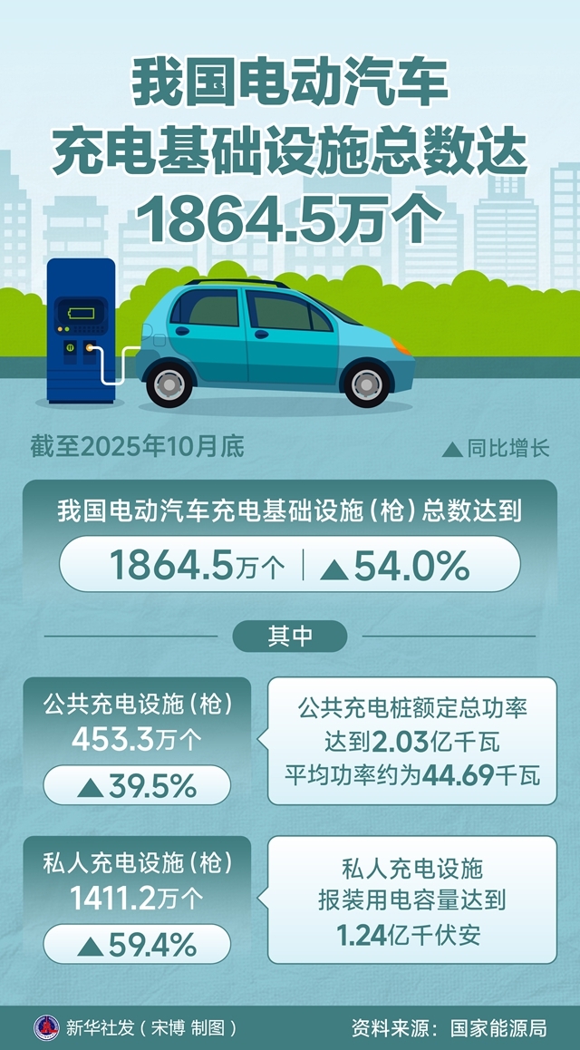 记者11月19日从国家江南官网app 获悉,截至2025年10月底,我国电动汽车充电基础设施(枪)总数达到1864.5万个,同比增长54.0%。