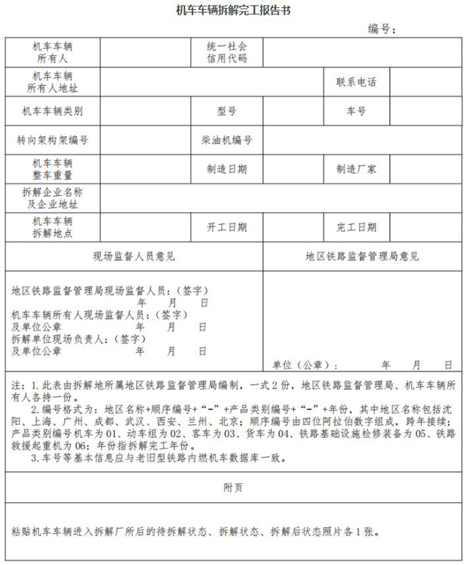 老旧型铁路内燃机车报废时应当以机车车号为唯一识别代码,经辖区地区铁路监督管理局确认机车车辆主体结构已被拆解且不可恢复,并出具《机车车辆拆解完工报告书》(见附件2)。