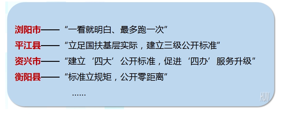 如浏阳市在前期开展“最多跑一次”改革取得积极成效的基础上,围绕“一看就明白、最多跑一次”;平江县立足国家扶贫开发工作重点县这个实际,围绕“立足国扶基层实际,建立三级公开标准”;资兴市围绕“建立‘四大’公开标准,促进‘四办’服务升级”;衡阳县推行“一码一事项,公开零距离”,分别开展试点工作,建立试点标准。