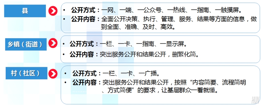 二是区别“三个层级”,分级分类公开。为增强公开实效,结合基层实际,我们提出区别县、乡、村“三个层级”,从公开内容和方式上分级分类公开。