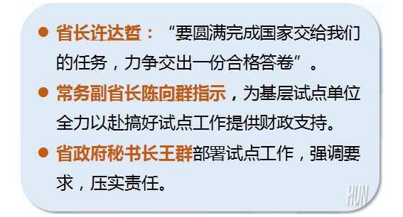 省长许达哲听取了试点工作专门汇报,明确指示“要圆满完成国家交给我们的任务,力争交出一份合格答卷”。常务副省长陈向群作出专门批示,要求省财政厅安排适当经费,支持、激励基层试点单位全力以赴搞好试点工作。省政府秘书长王群今年先后召开两次专题会议,研究部署试点工作,并在一月一次的秘书长办公会上,逢会必讲,强调要求,压实责任。承担试点任务的市州积极加强指导,支持试点工作。7个试点单位成立了以县(市、区)长为组长的试点工作领导小组,加强组织领导,组建专门队伍,聘请专家支撑,安排专门经费,推进试点工作。