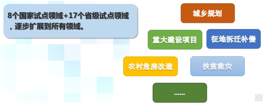 我省在7个国家级试点县市区的选择上,充分考试试点工作的代表性和针对性,既有建制县又有市辖区;既有经济基础相对较好的县级市,又有国家级贫困县。同时,我省全面铺开试点工作,增加了省级试点单位,确保一个市州有一个试点县,拓展了试点领域,选择湘潭县、新宁县、慈利县、安化县、中方县、冷水江市、永顺县7个县市为省级试点单位,承担城乡规划、重大建设项目、扶贫救灾等其他17个方面的试点任务。