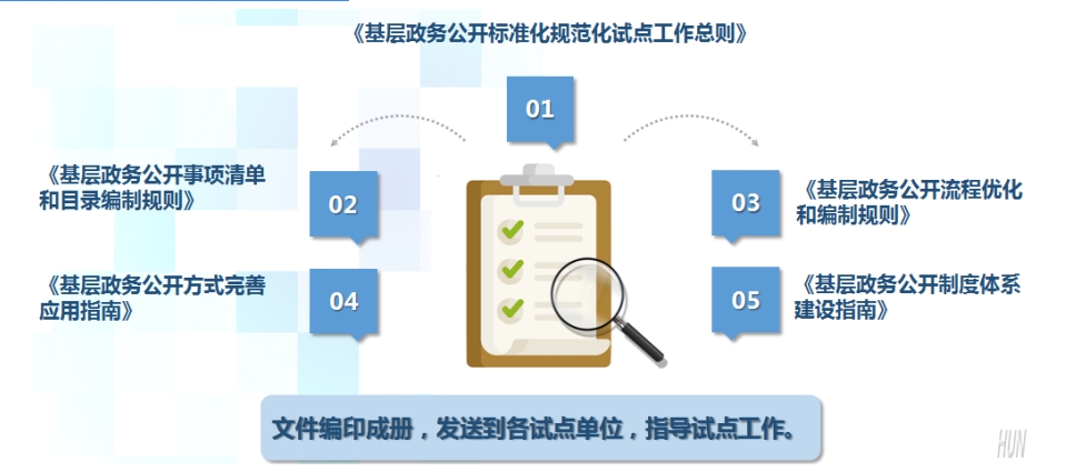 同时,由省政务公开领导小组办公室配套下发试点工作事项清单和目录编制规则、流程优化和编制规则等5个指导性文件,并将这些文件编印成册,发送到各试点单位,指导试点工作。
