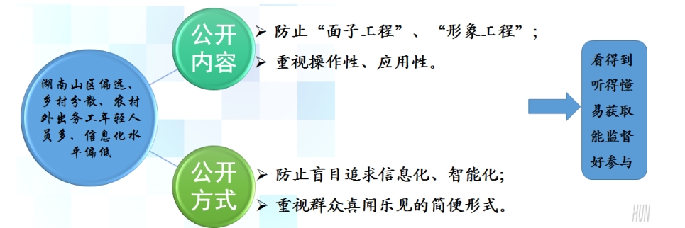 二是紧扣基层实际,确保试点工作不走样。我们要求各试点单位牢牢立足基层政府直接联系服务群众这个实际,牢牢立足湖南山区偏远、乡村分散、农村外出务工年轻人员多、信息化水平偏低这个特点,在编制标准文本、规范公开内容上,防止只求文本形式的标准化、美观化,而忽视文本成果的操作性、应用性,把公开工作复杂化,防止成为形式主义、“面子工程”、“形象工程”。