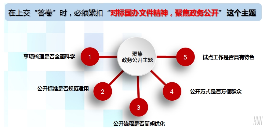 我们要求各试点县市区在开展试点工作中,可以大胆创新,全面推进政务公开、“互联网+政务服务”、智慧城市等工作,但在上交“答卷”时,必须对标国办文件精神,聚焦政务公开这个主题,围绕梳理事项是否全面科学、公开标准是否规范适用、公开流程是否简明优化、公开方式是否方便群众、试点工作是否具有特色来展开。