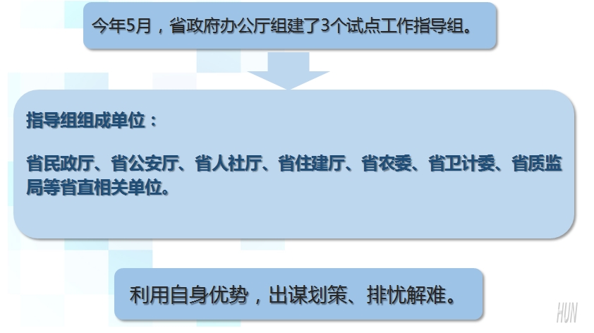 四是组建试点工作指导组。为加强对试点工作的指导,今年5月,省政府办公厅组建了由省民政厅、省人社厅、省质监局等省直相关单位参加的3个试点工作指导组,进驻试点单位进行面对面、点对点指导。