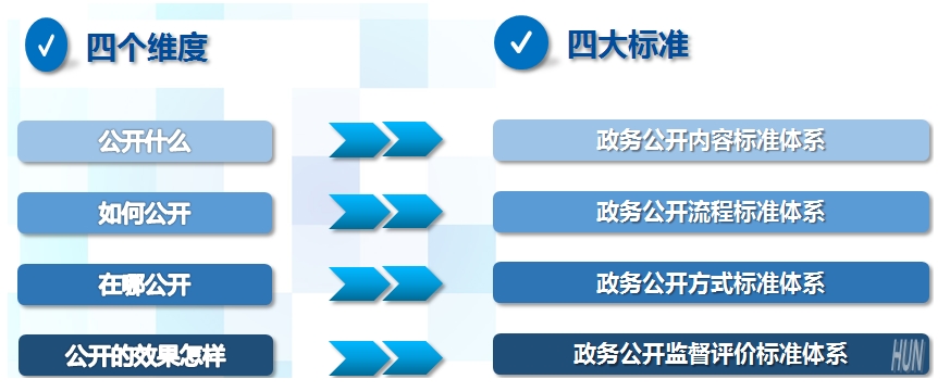 一是围绕“四个维度”,建立“四大标准”。围绕“公开什么、如何公开、在哪公开、公开的效果怎样”四个维度,我们提出建立“政务公开内容标准体系、流程标准体系、方式标准体系和监督评价标准体系”四大标准。